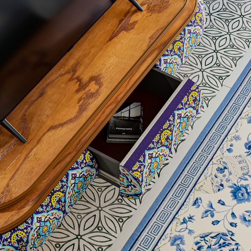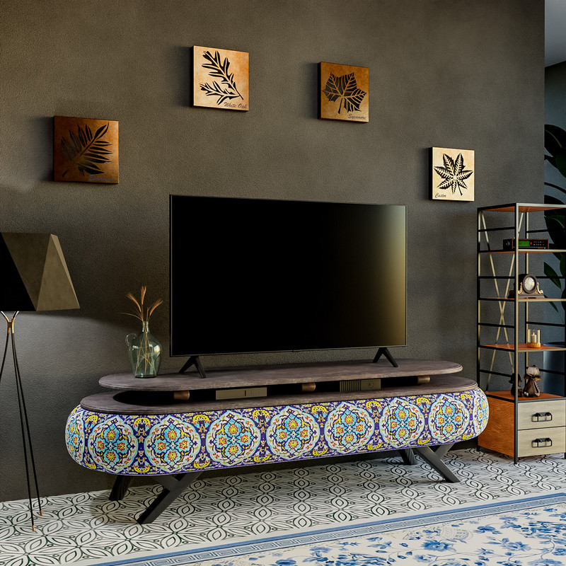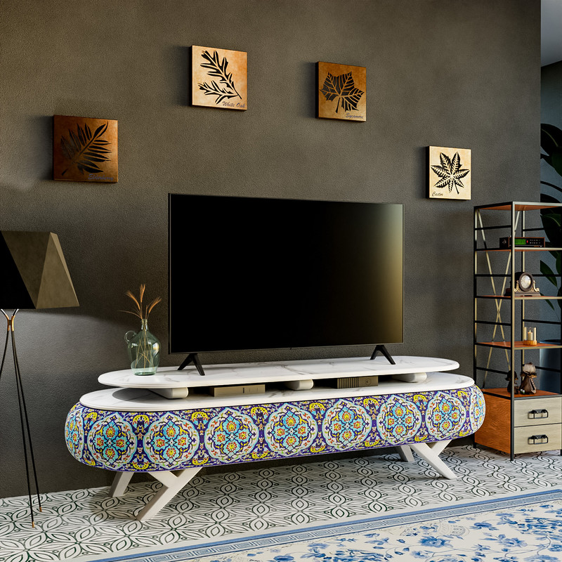 میز تلویزیون مدل AK-22 سایز 140 با طرح پارچه زیبای اسلیمی به رنگ آبی و سفید، در چهار رنگ چوب افرا، گردو، سفید و طوسی، یک انتخاب عالی برای تجهیزات خانه و محیطهای نمایش تلویزیون شماست.
