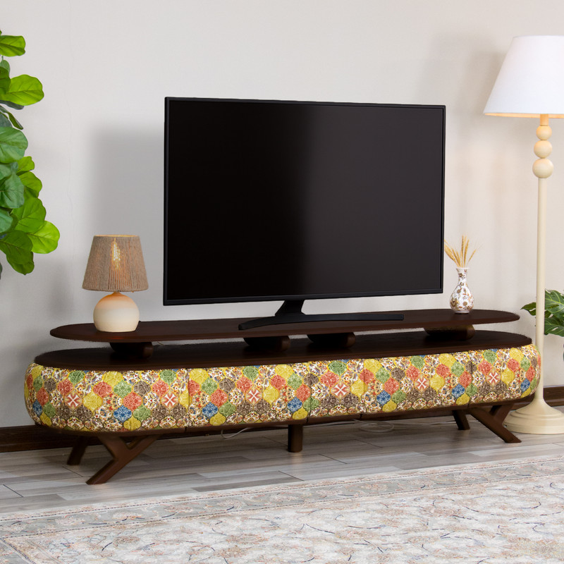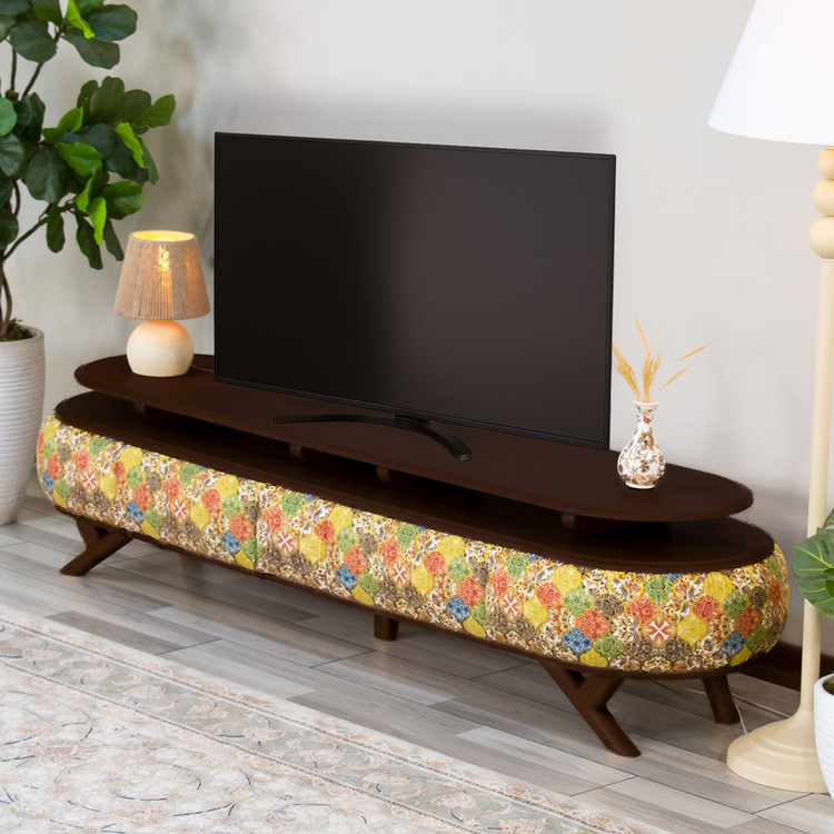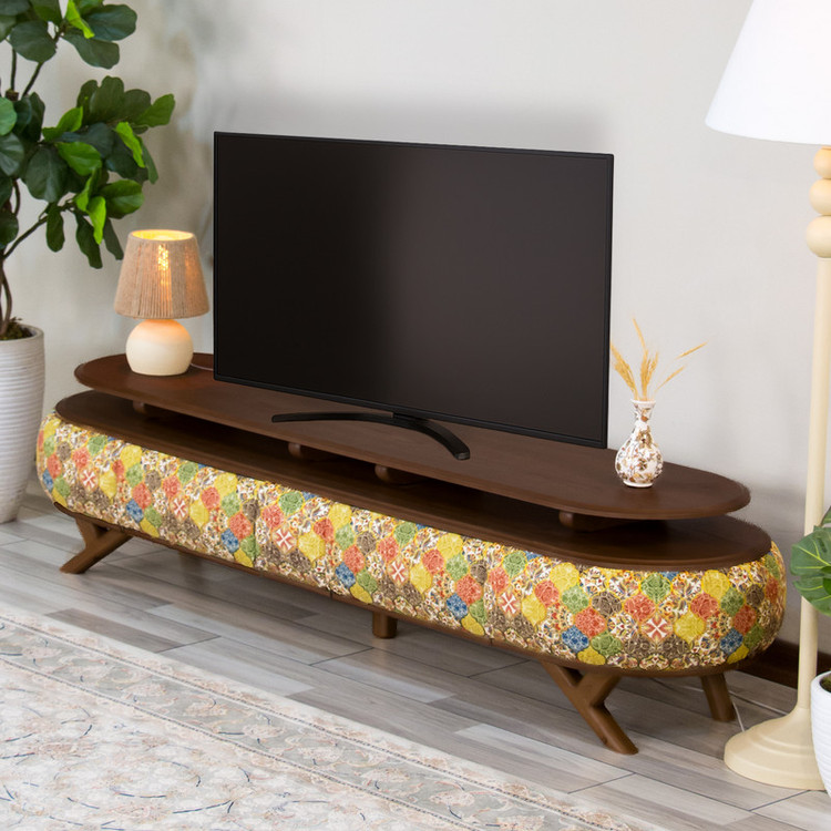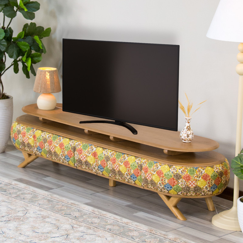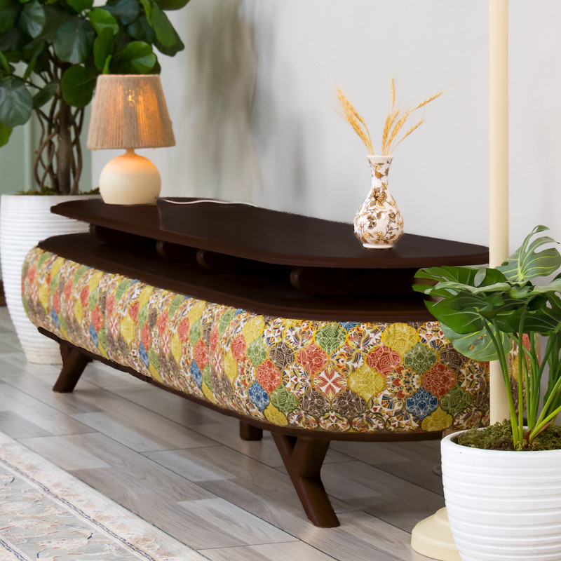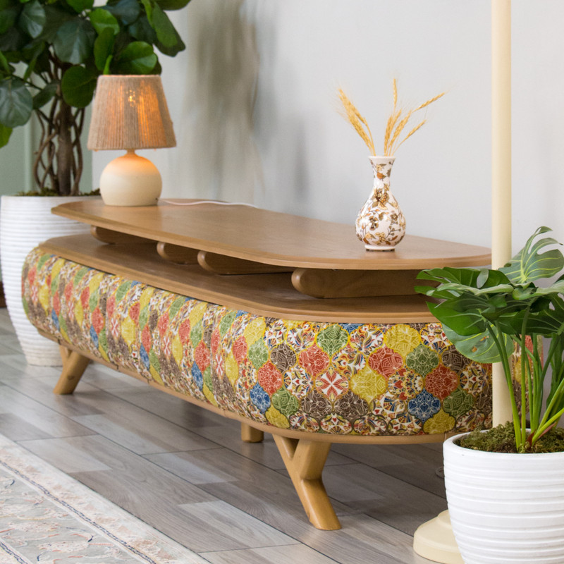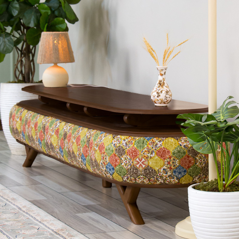 در طراحی میز تلویزیون نقش طرح «هنگام» سایز 190 سانتی متری، بافت سنتی در همآمیخته با رنگهای زنده و جسور، روی پارچهی مخملی جلوهای چشمگیر یافته که یادآور کاشیکاریهای ایرانیست.