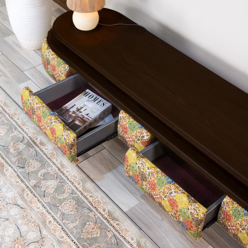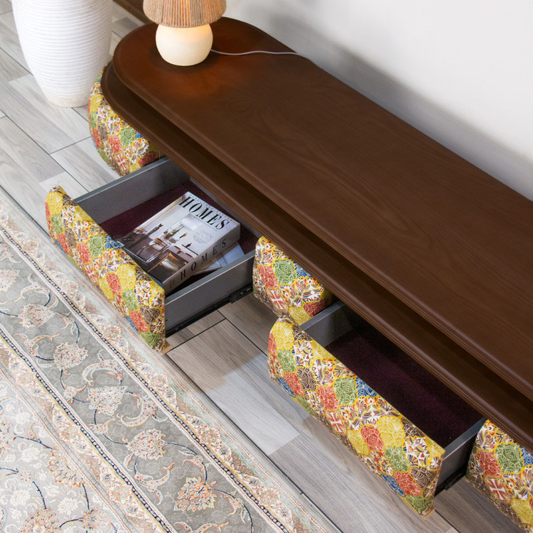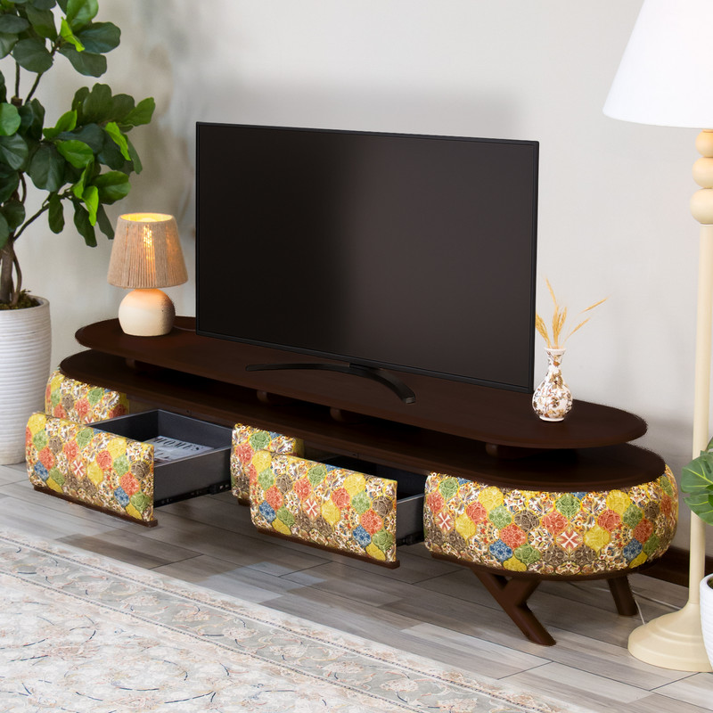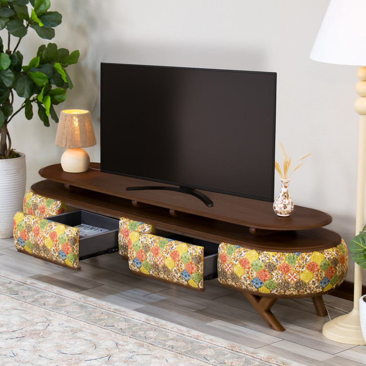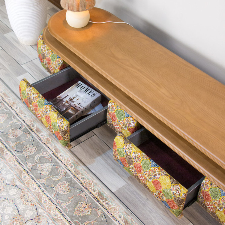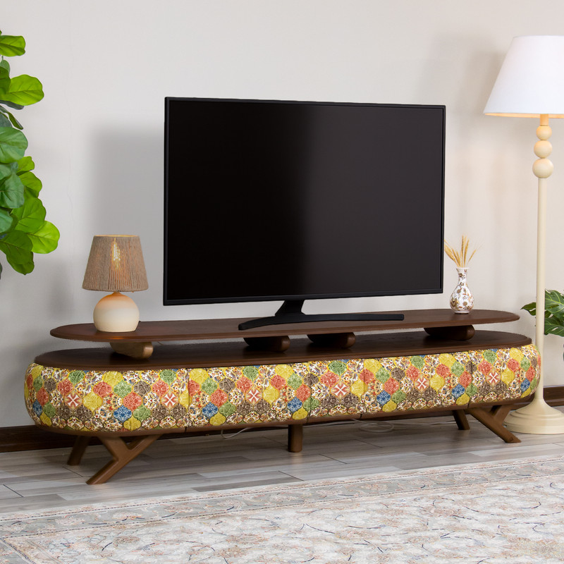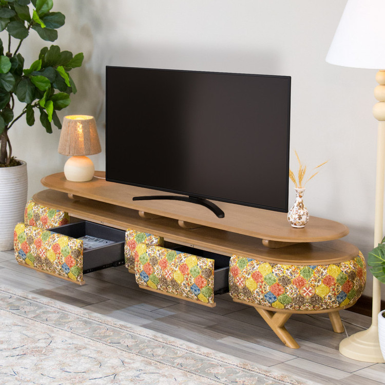 در طراحی میز تلویزیون نقش طرح «هنگام» سایز 190 سانتی متری، بافت سنتی در همآمیخته با رنگهای زنده و جسور، روی پارچهی مخملی جلوهای چشمگیر یافته که یادآور کاشیکاریهای ایرانیست.
