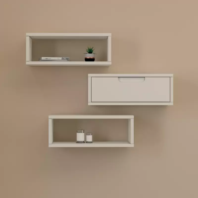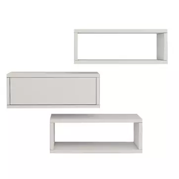 شلف دیواری سفید قهوه ای ام دی اف ضدخش مدل S.H001 با طراحی متمایز در سبک مینیمال از دو باکس بدون درب و یک باکس با درب مجزا برای قرار دادن انواع وسایل دکوری تشکیل شده است و با انواع فضاهای کار یا محیط منزل شما هماهنگ می باشد.