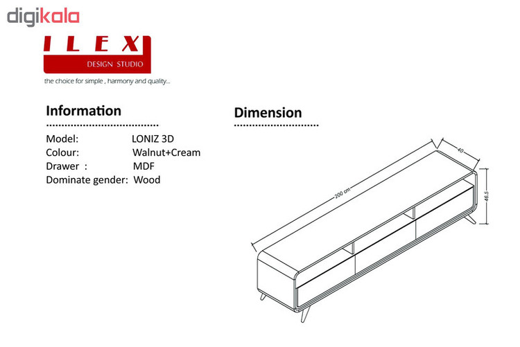 این روزها سبک مینیمالیستی که شهرت آن به ساده گرایی است، محبوب ترین سبک طراحی خانه در میان مردم است. دکوراسیون اتاق نشیمن به سبک مینیمالیستی انتخاب افرادی است که سلیقه های خاص دارند. ایجاد زاویه های منحنی در گوشه های میز آیلکس مدل LONIZ 3D و به تبع آن در بخش هایی از کشو ، فرم خاص پایه ها و قرارگیری آنها به صورت مورب ، تکرار شکل مستطیل در طراحی بدنه ، طبقه و کشوها و حذف دستگیره ها با هدف ایجاد دید بصری مناسب در بیننده، تجسم کاملی از این سبک طراحی به شمار می رود. وجود سه کشو و طبقه در این میزها فضای کافی و مناسبی جهت قرار دادن دستگاه های دیجیتال و کنسول بازی که معمولا وسایل جانبی زیادی به همراه خود دارند را برای شما فراهم می سازد. وجود رگه و گره در بافت چوب همیشه حس گرمی و آرامش را به بیننده القا می کند که در میزهای لونیز تری دی پلاس والنات به سبب نوع رنگ آمیزی خاص آن ، زیبایی بافت چوب با وضوح بیشتری به چشم می خورد. زیبایی طبیعی رگه های چوب موجود در این میزها به همراه رنگ گردویی و کرم آنها روح تازه ای به دکوراسیون منزل شما دمیده و زیبایی آن را دوچندان خواهد کرد. در ساخت میز لونیز از تلفیق چوب های راش سوپر وارداتی و ام دی اف بهره برده ایم ، یراق آلات با کیفیت اروپایی و پیچ ها و اتصالات الیت که به صورت مخفی در کار هستند از دیگر محاسن این میزها به شمار می روند. در واقع در هیچ کجای ظاهر میزتان پیچی مشاهده نمی کنید. رنگ میزهای آیلکس همگی پلی یورتان بوده و با گذشت زمان و تابش نورهای مختلف به هیچ عنوان تغییر رنگ نخواهند داشت. بسته بندی میزهای آیلکس به وسیله ی نایلون حباب دار ، پلاستو فوم ، نبشی های محافظ در چهار طرف میز و در کارتن های مخصوص پنج لایه با رعایت کامل اصول ایمنی انجام شده که حتی در جا به جایی های طولانی از آسیب در امان می باشند.