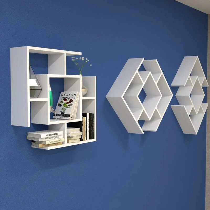 شلف دیواری ام دی اف طرح مربعی رنگ سفید و نقره ای