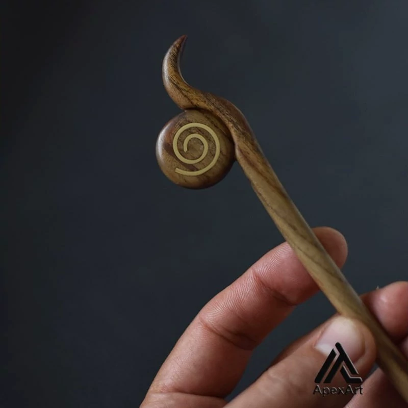 این کانزاشی مینیمال، تجسم ظریفی از هماهنگی بین طبیعت و هنر است. ساخته شده از چوب گرم و خوشرنگ پسته، این پین مو با یک طرح مارپیچ (اسپیرال) ظریف از مفتول برنج تزئین شده که یادآور حرکت مداوم زندگی است.