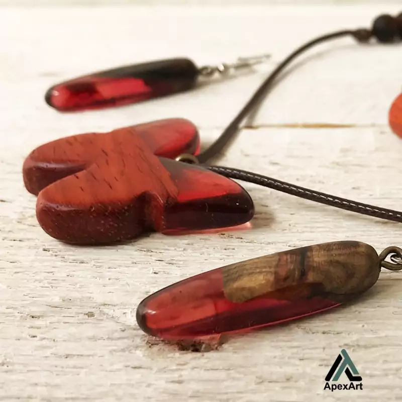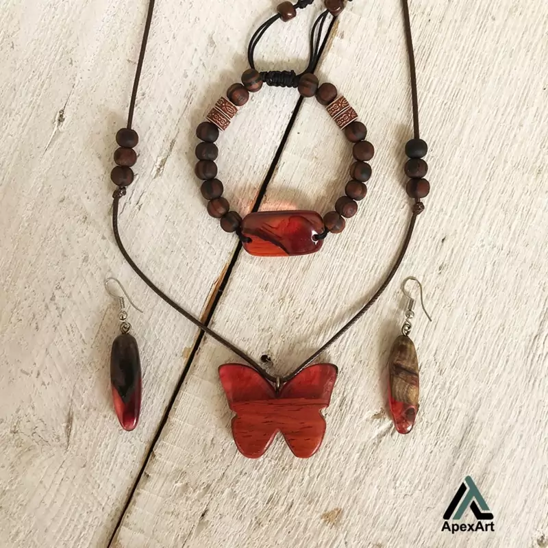 جنس چوب دستبند و گردنبند از چوب پادوک می باشد و چون گشواره ها از چوب گردو