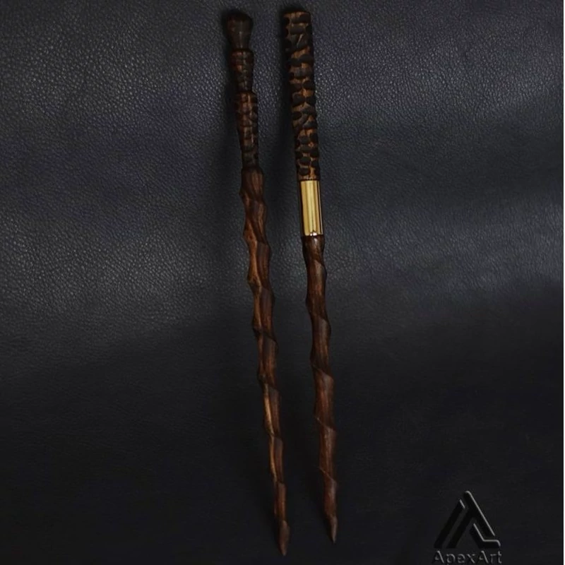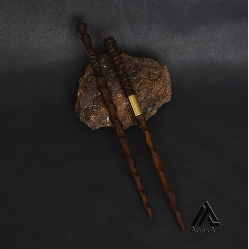 هر دو پین مو دارای طراحی منحصر به فرد مارپیچی (اسپیرال) در قسمت انتهایی خود هستند که به زیبایی آنها افزوده است. یکی از پینها با یک لوله برنجی پولیش شده در قسمت میانی تزئین شده که پس از پرداخت، جلوهای طلایی و درخشان پیدا کرده و تضاد زیبایی با بافت طبیعی چوب ایجاد کرده است.