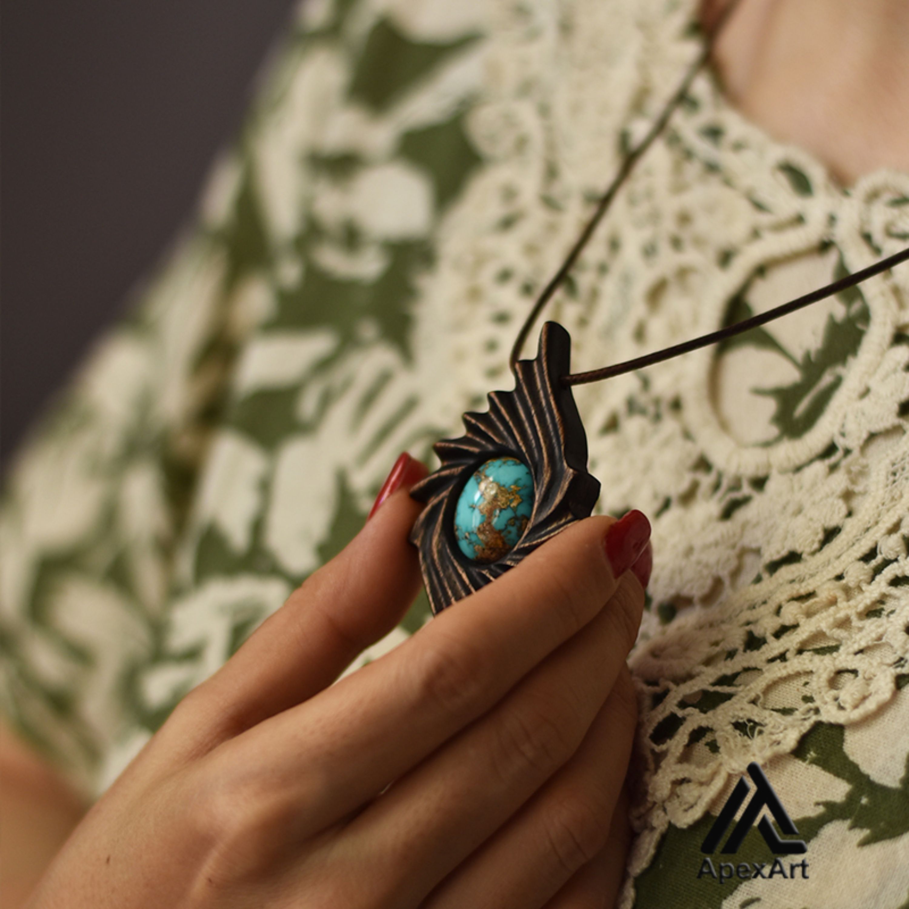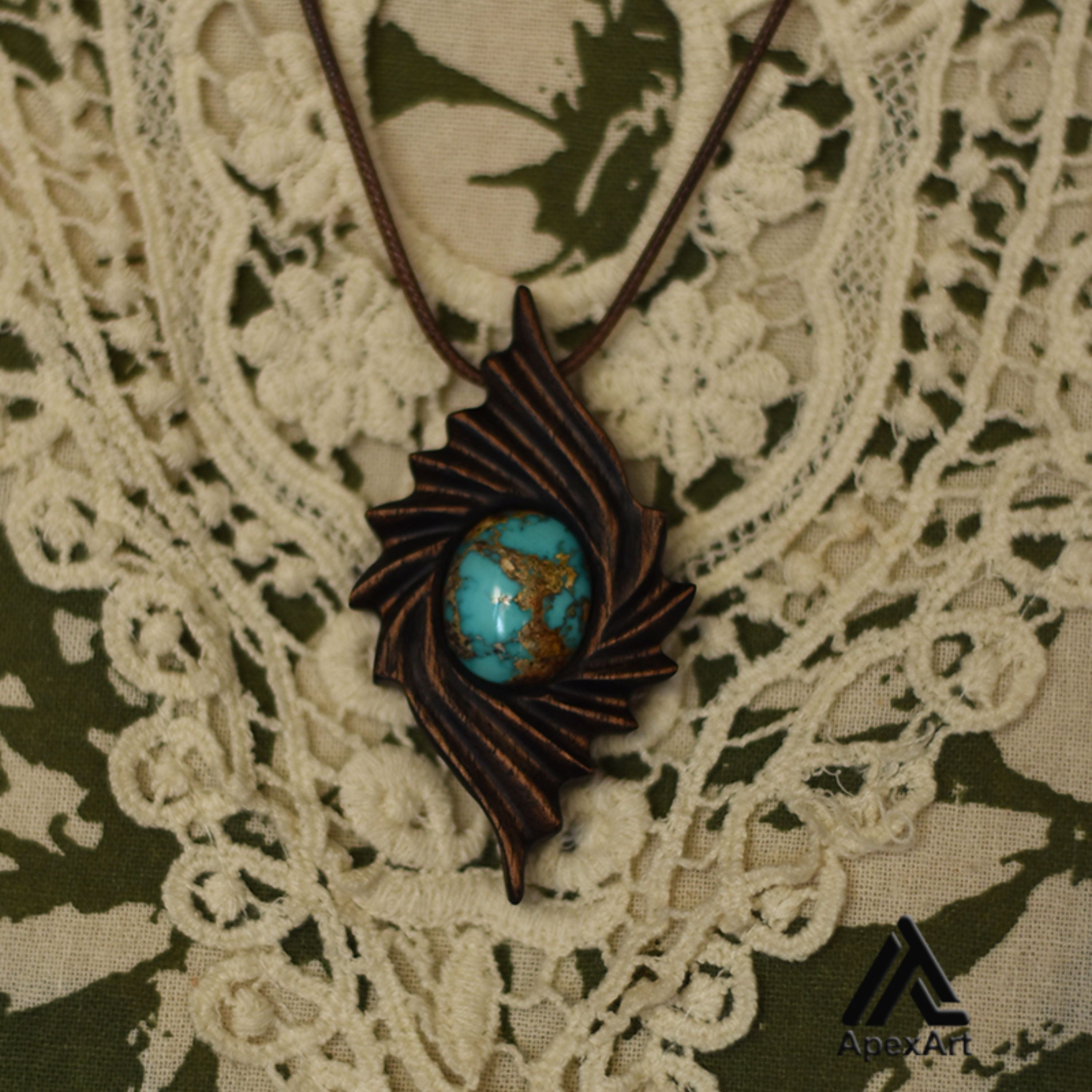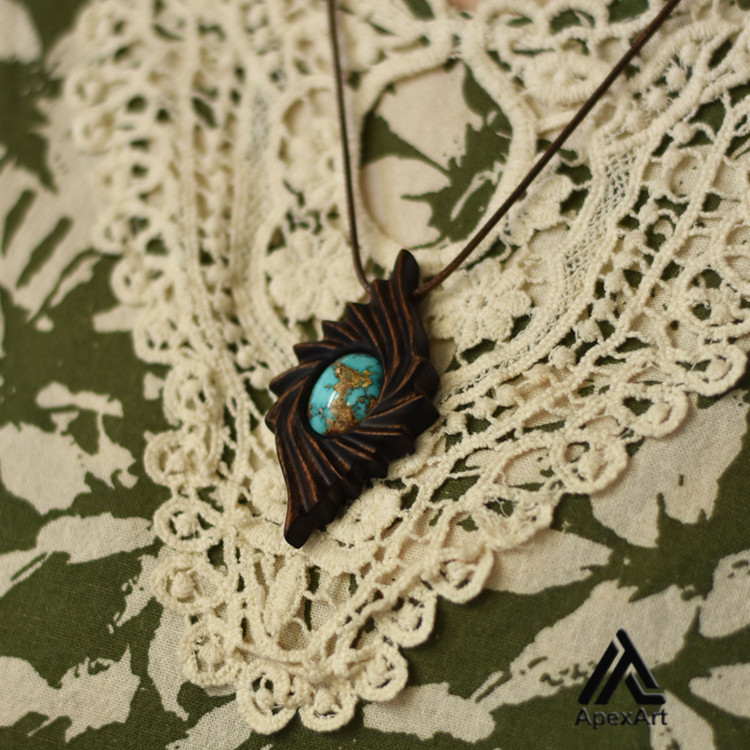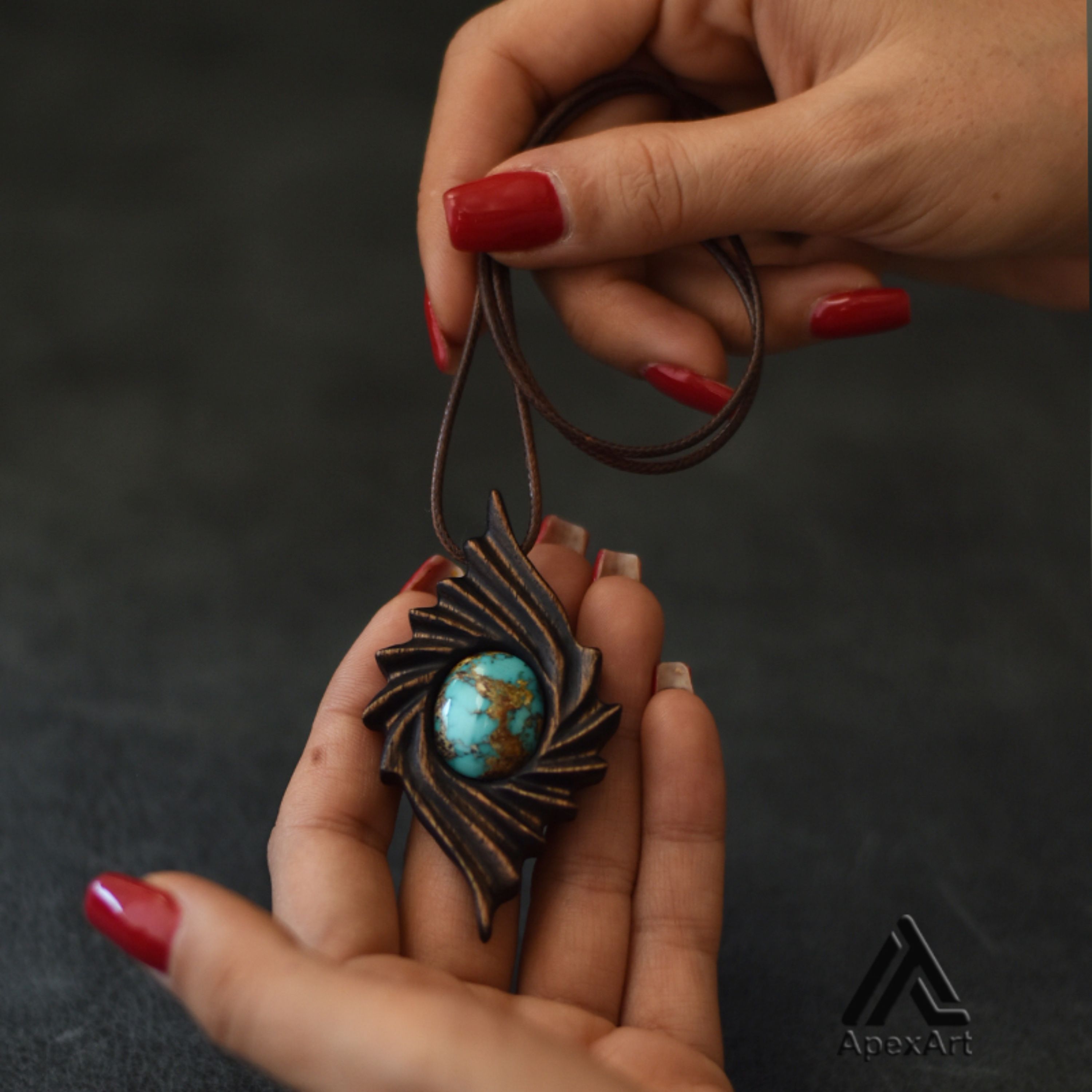 یه گردنبند خاص دست ساز که از ترکیب زیبای چوب گردو و نگین فیروزه نیشابور که نگین فیروزه به شکل گنبدی و دامله تراشیده شده و جزء نگین های خوش رنگ و زیبا هست.