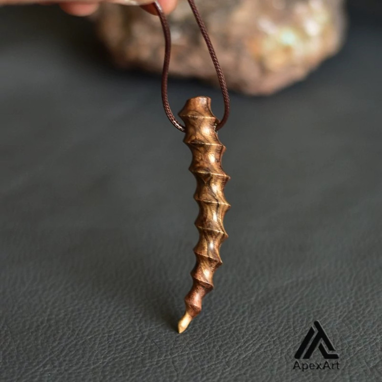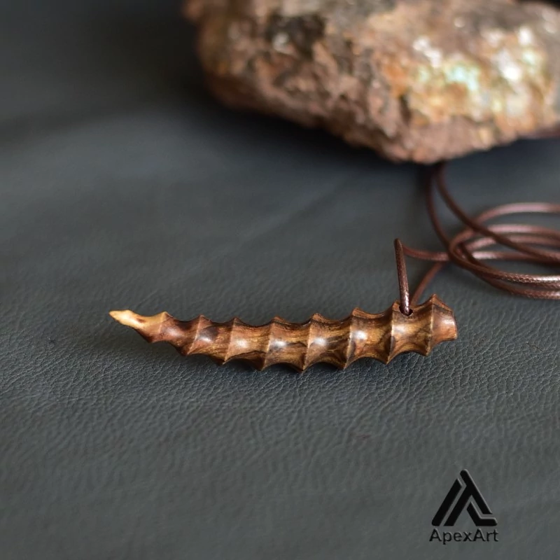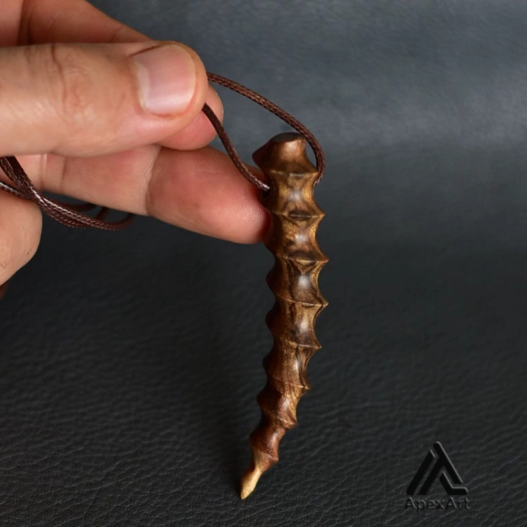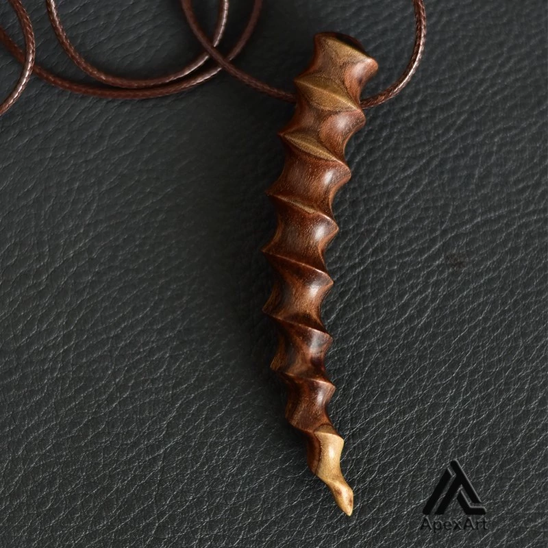 این گردنبند یک اثر هنری منحصر به فرد است که با استفاده از چوب پر نقش و نگار پسته به شکل شاخ قوچ یا عاج فیل ساخته شده است. این گردنبند به دلیل داشتن بافت های زیاد روی سطح آن، یک ظاهر زیبا و استثنایی دارد.