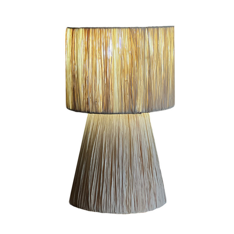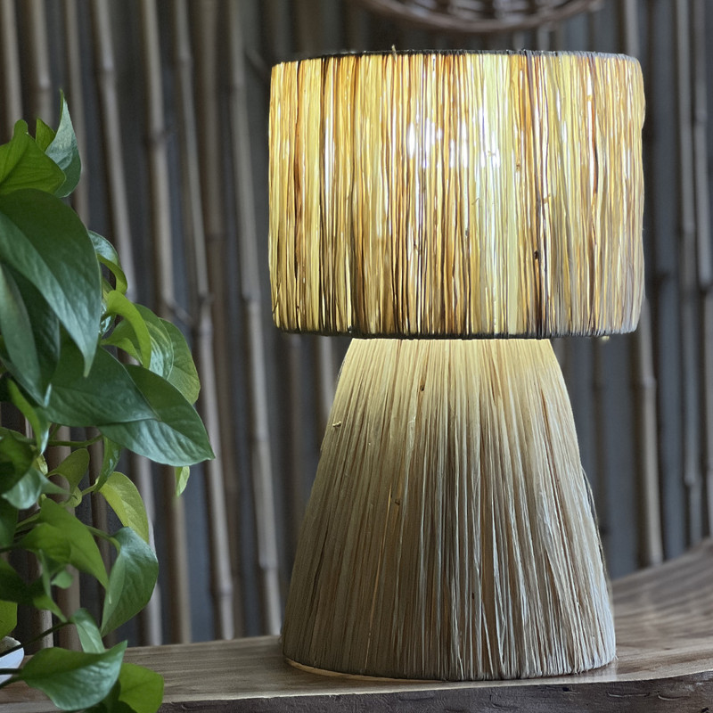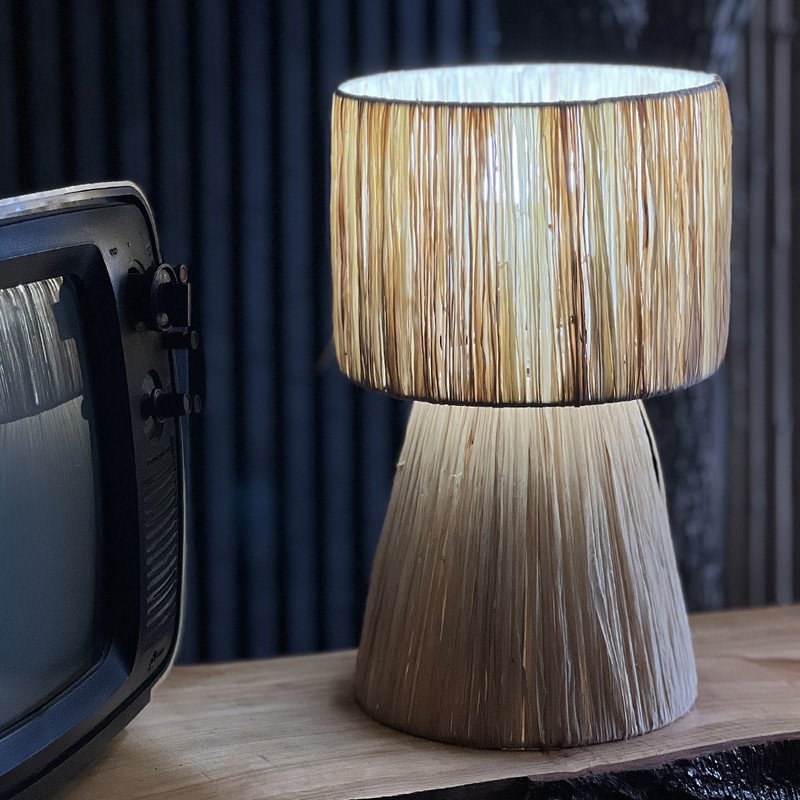 این چراغ با استفاده از الیاف طبیعی رافیا و به صورت کاملاً دستی بافته شده است. هر قطعه: