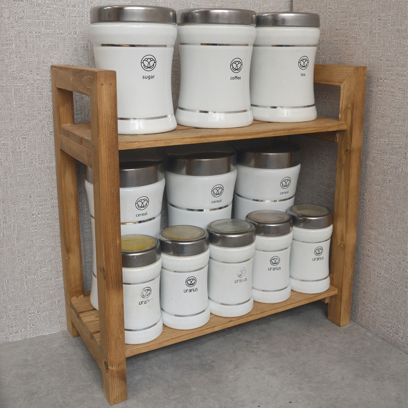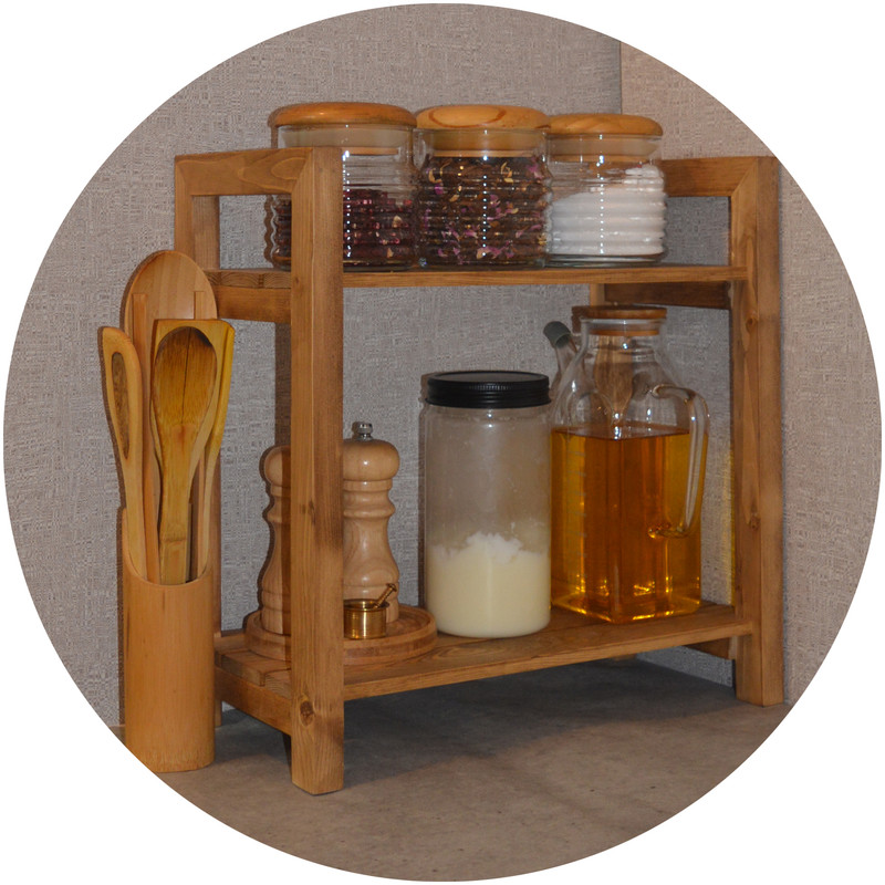 استند جا ادویه ای 2 طبقه- طرح کافی بار1: قابل استفاده جهت قراردادن ماگ ها - بانکه ها-ادویه جات - کافی بار -شلف رومیزی و... در نقش ارگانایزر آشپزخانه کمک بسیارشایانی را به شما در استفاده بهینه از فضا و چیدمانی شیک تر میکند. این استند از چوب روس با کیفیت ساخته شده است. ضمنا قابل ذکر است که با توجه به نقش و رگه های هر قطعه چوب میتواند محصول نهایی یک پرده در رنگ آن تغییر داشته باشد.