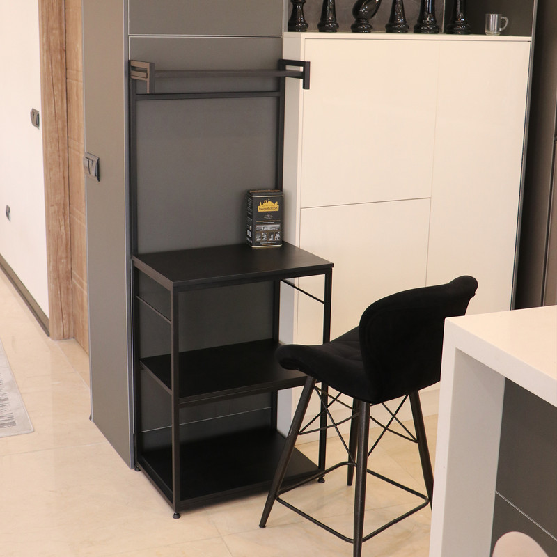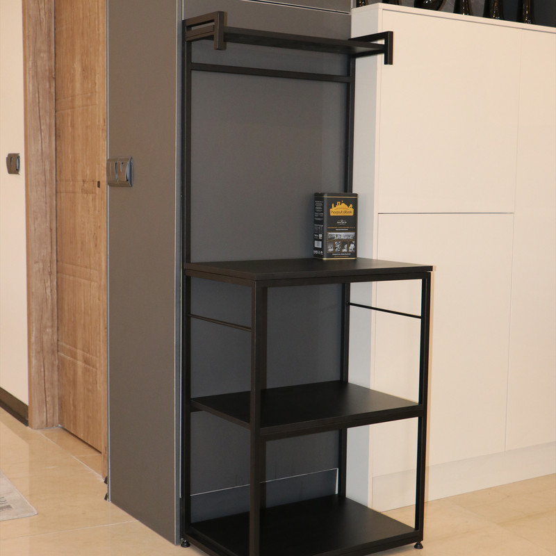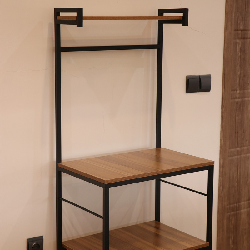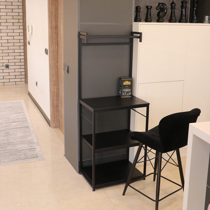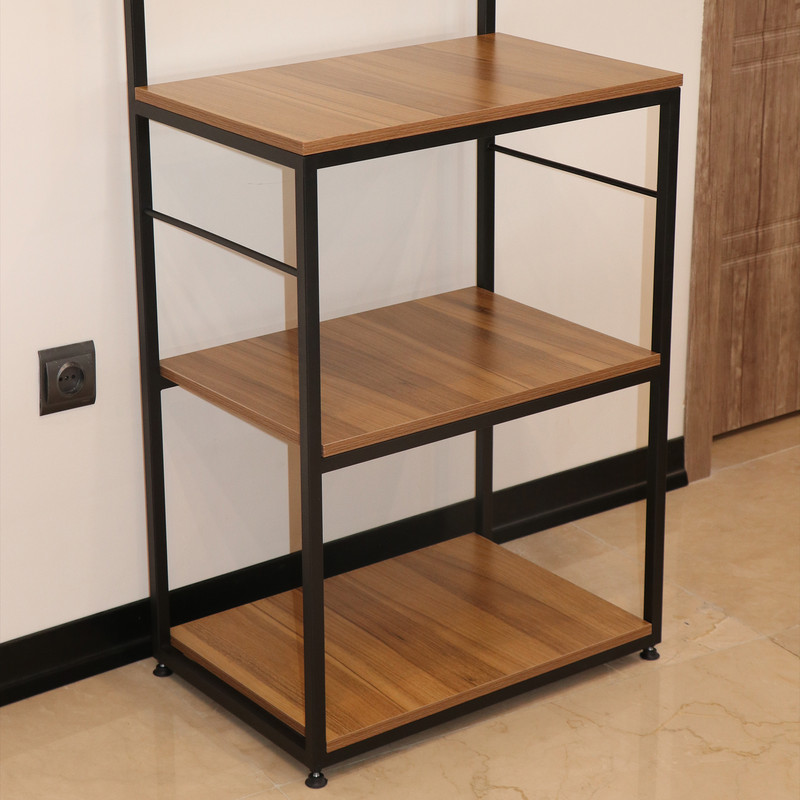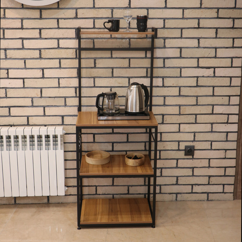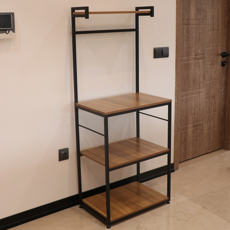 این شلف بهطور هوشمندانه برای استفاده بهینه از فضا در آشپزخانههای کوچک مدرن یا کنجهای خلوت پذیرایی طراحی شده است و به محیط مرتب و کارآمدی میبخشد.